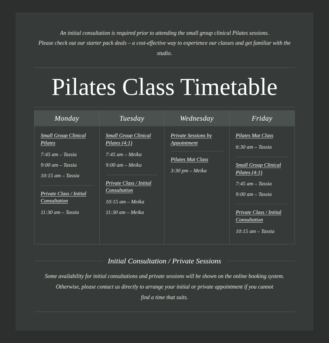 Pilates Timetable